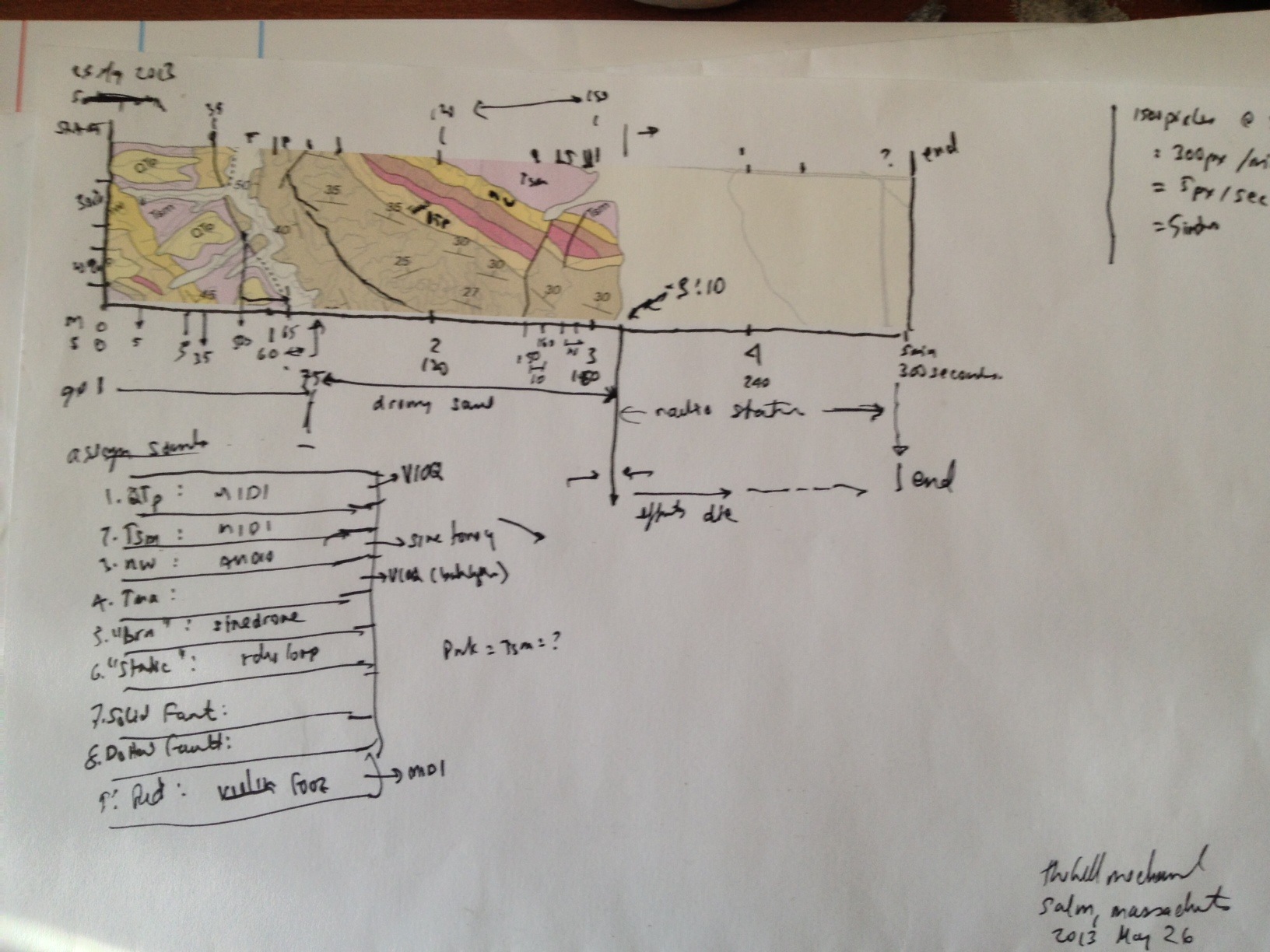 Collected the map areas into eight ‘categories’ (to keep it tractable– I lumped together two separate yellows as one tone, for example) and did what I could to read it as a score. Six MIDI instruments (mostly processed Korgs softsynths), keyed in by hand. The “score” was complicated enough that it was best treated like a comp sheet. In addition, two samples of my own were drawn in by hand in the proper places (relative to the other sounds/features).